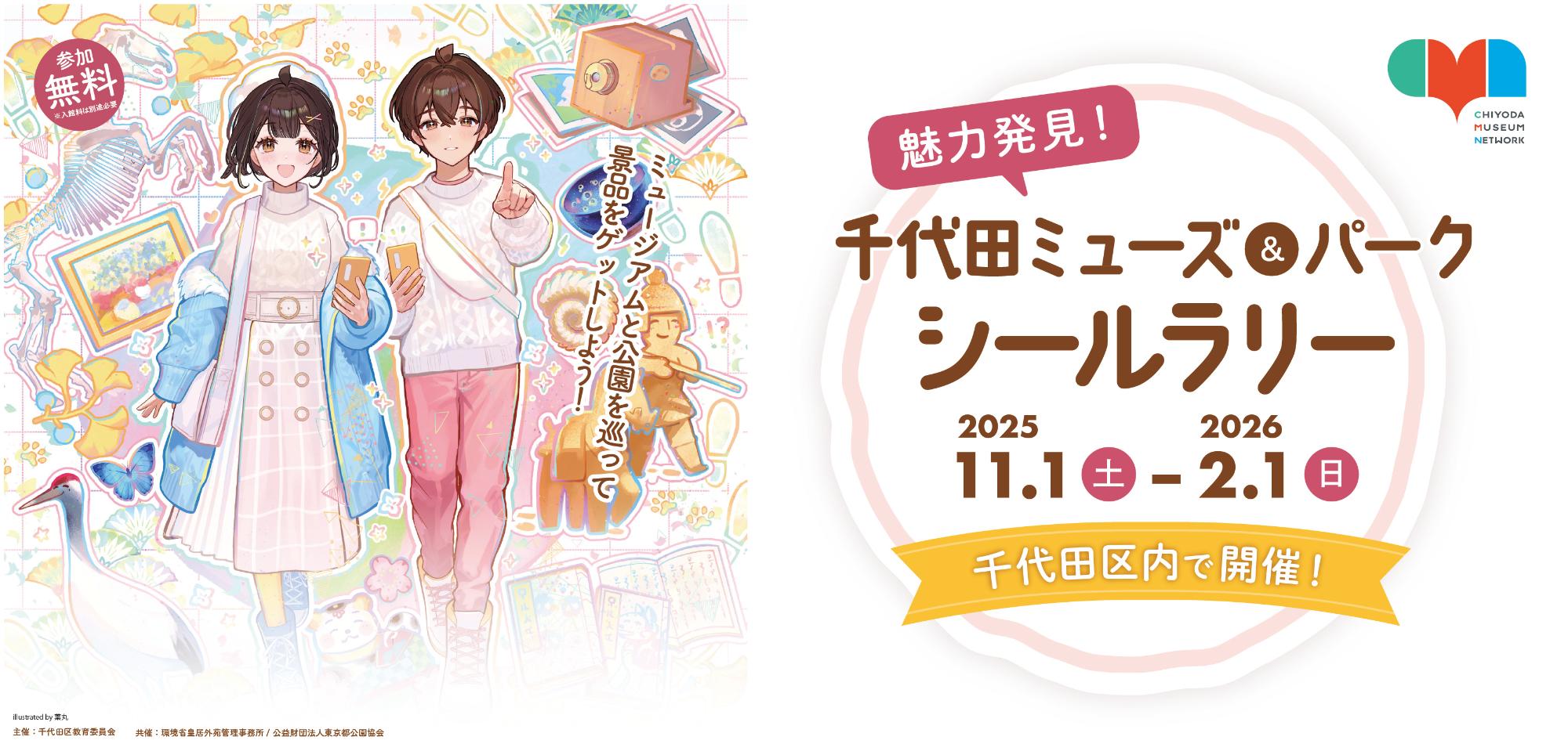 千代田区内で、千代田ミュージアムネットワーク参加館の一部と、皇居外苑・北の丸公園・日比谷公園をめぐるシールラリーです。シールを集めて景品をゲットしよう!